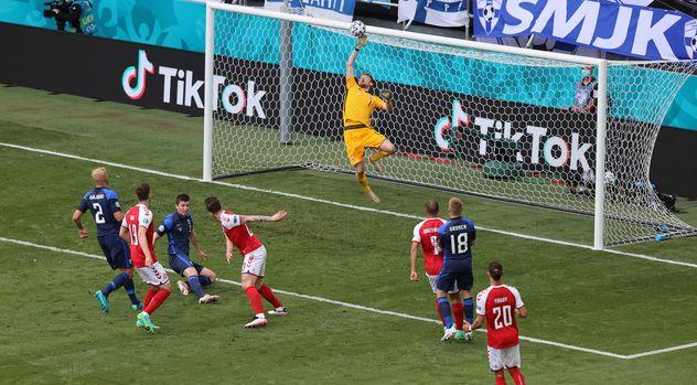 Поскакал мяч по штрафной, после подачи углового от Дании с правого фланга, но удара мы так и не увидели.