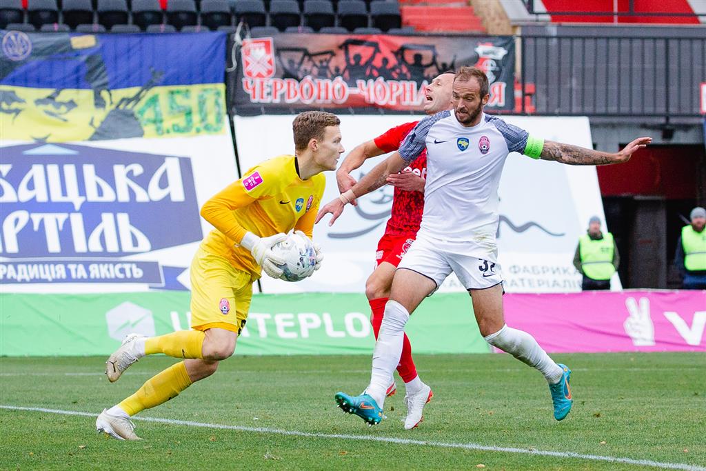 ТАНКОВСЬКИЙ! Чурко скинув подачу кутового з правого флангу на ногу супернику перед штрафним, але той низом пробив комфортно для Мацапури.