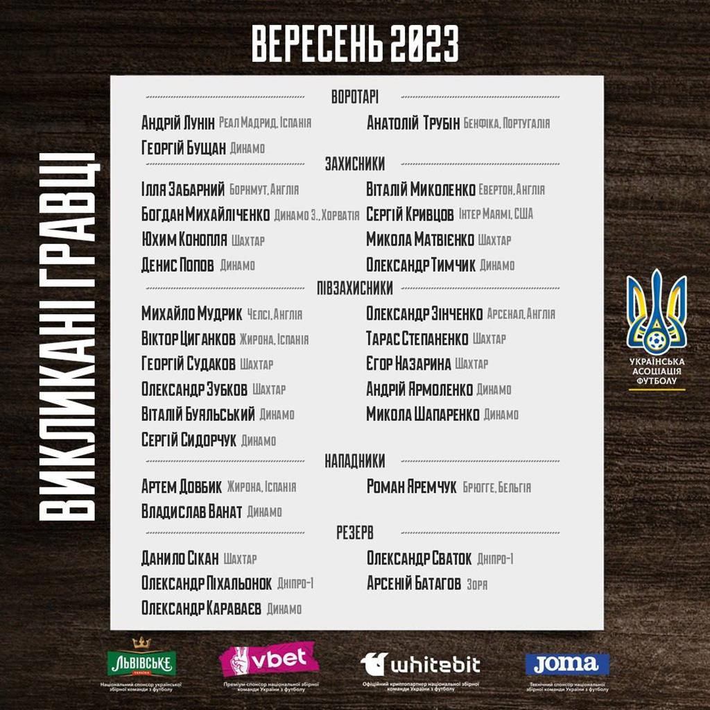 Запасні: Трубін, Лунін, Михайліченко, Кривцов, Сидорчук, Ярмоленко, Довбик, Буяльський, Ванат, Попов, Назарина, Караваєв.