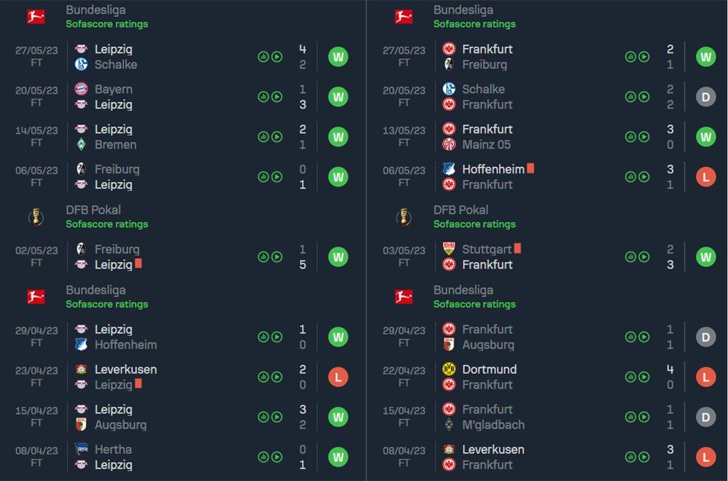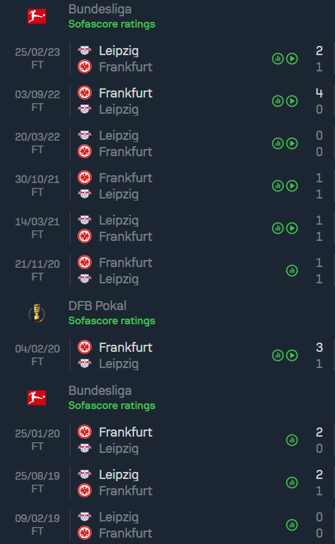 Якщо говорити про особисті зустрічі, то команди зіграли між собою 16 матчів, із яких РБ Лейпциг виграв 4, а Айнтрахт Ф — 5, нічию зафіксовано 7 разів. Статистика забитих м'ячів також на користь "орлів" — 19:24.