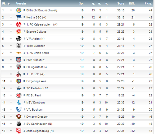 Клубам 2БЛ остается сыграть еще по 15 матчей, то есть каждый, кто желает повыситься в классе, может побороться за 45 очков. Это немало, вот только лидеры второго дивизиона Айнтрахт из Брауншвайга и берлинская Герта опережают третью команду на двенадцать и десять очков соответственно. Команда, занявшая по итогам сезона третье место, сыграет с 16-й командой 1БЛ в переходных матчах. Брауншвайг и Герта имеют в активе 44 и 42 очка, что является прекрасным результатом для обоих. В истории второй Бундеслиги только две команды набирали больше очков после первых 19-ти туров, это Нюрнберг в сезоне 2000/01 (45 очков) и Ганновер в 2001/02 (43). И франконцы, и нижнесаксонцы в итоге выходили в первую Бундеслигу с первой строчки. Кроме того, ни Айнтрахт (чемпион Германии 1966/67), ни Герта (чемпион 1930 и 1931 годов) в первом круге не подавали признаков приближающегося спада.