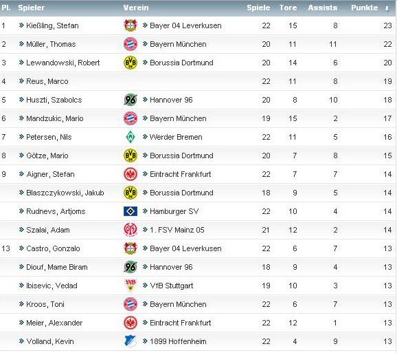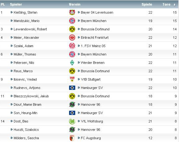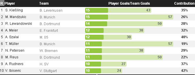 Из лидеров бомбардирской гонки в этом туре отличились Штефан Кисслинг и Марио Манджукич, которые благодаря этому ушли в отрыв от Роберта Левандовски. Отметим также то, как в компанию лучших забивал стремительно врываются Нильс Петерсен, который отметился вторым дублем за последние несколько матчей, а также Марко Ройс, отличившийся вторым хет-триком в профессиональной карьере. Кроме того, не можно обойти вниманием Сашу Мёлдерса, забившего по возвращении после травмы восемь мячей за 939 минут игрового времени, что является довольно высоким показателем.