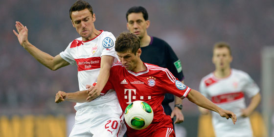 Все же класс Баварии давал о себе знать. Как раз по истечению получаса игры Алаба смог протолкнуть мяч в штрафную на Роббена. Таски не успел на мяч, и сбил Арьена, но арбитр не поставил достаточно очевидный пенальти. Интересно, что спустя пять минут, когда в менее очевидном эпизоде Лам упал в штрафной Штутгарта после столкновения с Траоре, Грэфе указал на точку. Мюллер хладнокровно реализовал одиннадцатиметровый.