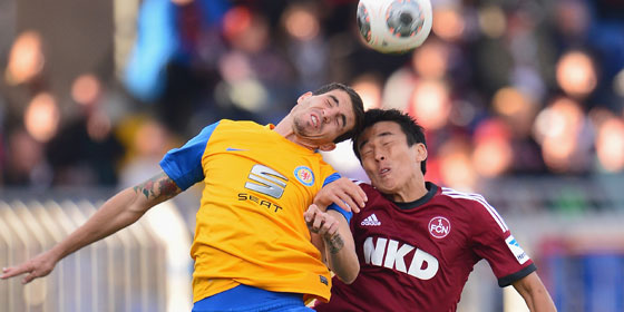 Очень интенсивный и эмоциональный матч состоялся в Брауншвейге, где в очной дуэли сошлись две команды, занимающие последние два места в турнирной таблице. Айнтрахту, который проиграл четыре матча кряду, нужно было кровь из носу набирать очки. Давление в Брауншвейге росло, а после того как наставник Львов Торстен Либеркнехт заговорил о неблагосклонности судей, от Айнтрахта даже повеяло безысходностью. Но матч с Нюрнбергом хозяева начали бодренько, и на 10 минуте Беллараби, оказавшись с мячом на левом углу вратарской, мог открывать счет, но сыграл слишком нерасторопно и запорол момент.