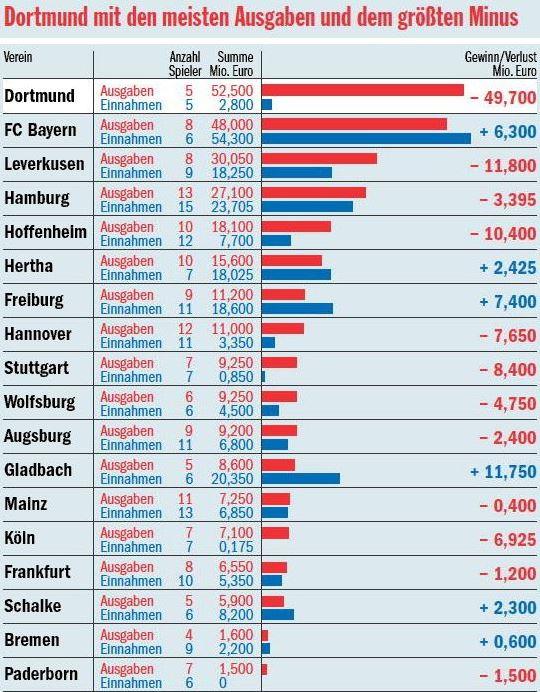 На этой таблице поданы раходы и доходы на трансферы каждого отдельного клуба Бундеслиги, а также трансферное сальдо: