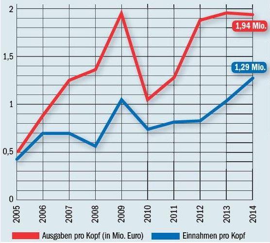 Эта диаграмма демонстрирует изменения средней стоимости входящих и исходящих трансферов одного игрока в Бундеслиге за последние десять лет (красная линия — расходы, синяя — доходы).