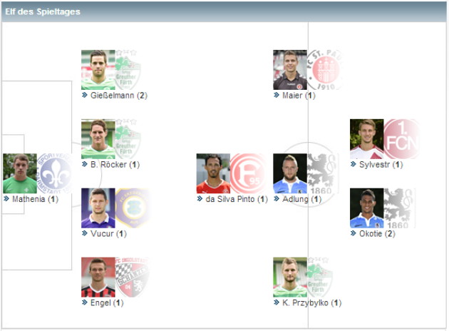 Сразу три поединка завершились со счетом 1:1. Так во Франкфурте одноименная команда не сумела удержать победу над Эрцгебирге. Хозяева поля начали с места в карьер и до середины тайма могли обеспечить себе серьезный задел в счете, но забили лишь однажды. Это Умари из центра штрафной завершил трехходовку, организованную Биттроффом и Энгельсом. Далее все шло по плану Франкфурта, как вдруг за 20 минут до финального свистка гости после розыгрыша штрафного организовали атаку, очень похожую на голевое наступление франкфуртцев. Ничью своей команде подарил хорватский центрбек Вукур. Вернуть преимущество Франкфурту мог вышедший на замену мальтиец Шембри, но, оказавшись перед пустым углом ворот, он просто не дотянулся до мяча.