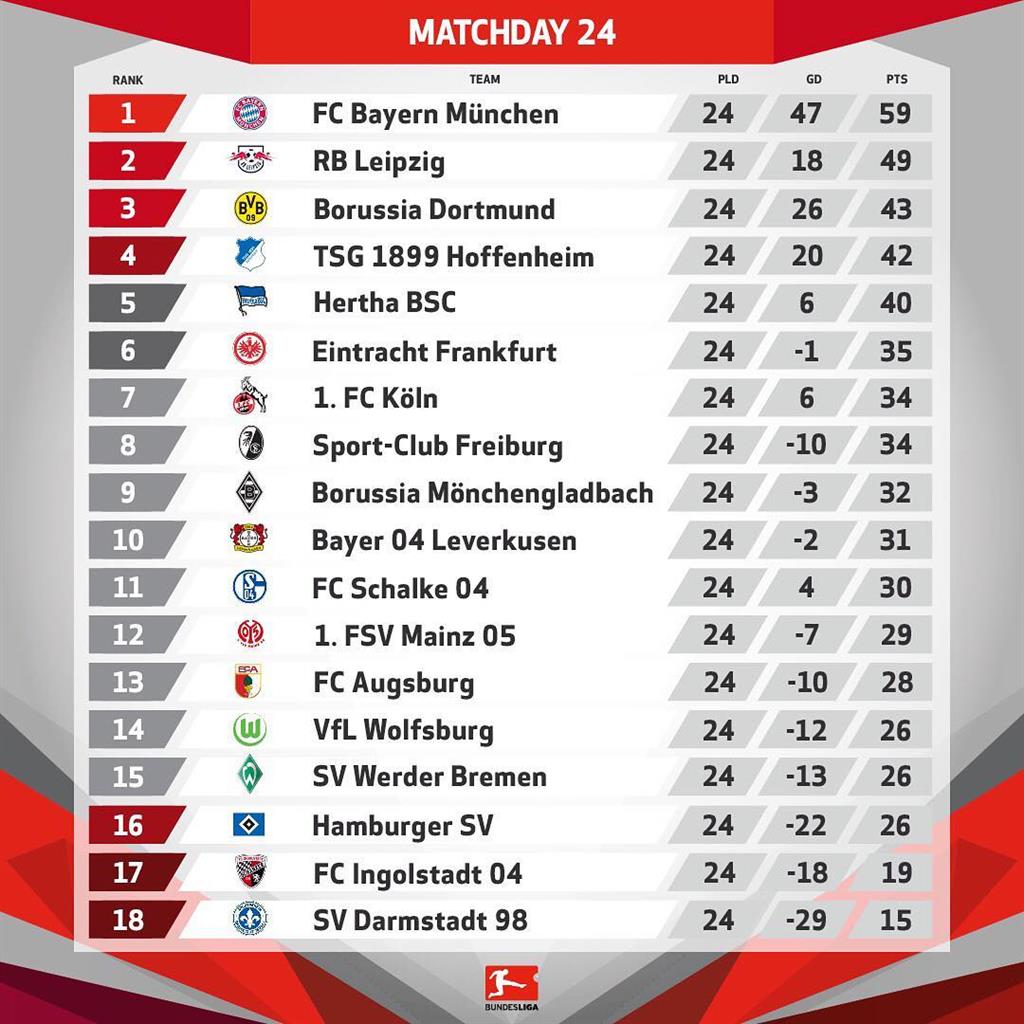 Турнирная таблица после 24-го тура Бундеслиги: