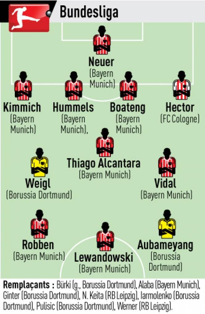 Топ-11: Нойер (Бавария) — Киммих (Бавария),Хуммелься (Бавария), Боатенг (Бавария), Хектор (Кельн) – Вайгль (Боруссия Д), Тиаго Алькантара (Бавария), Видаль (Бавария) — Роббен (Бавария), Левандовски (Бавария), Обамеянг (Боруссия Д).
