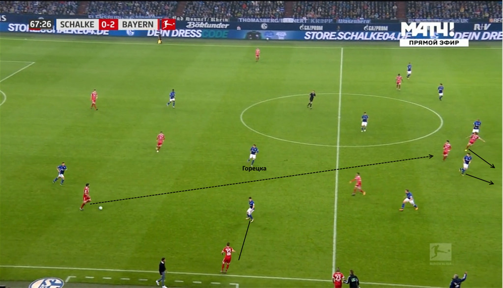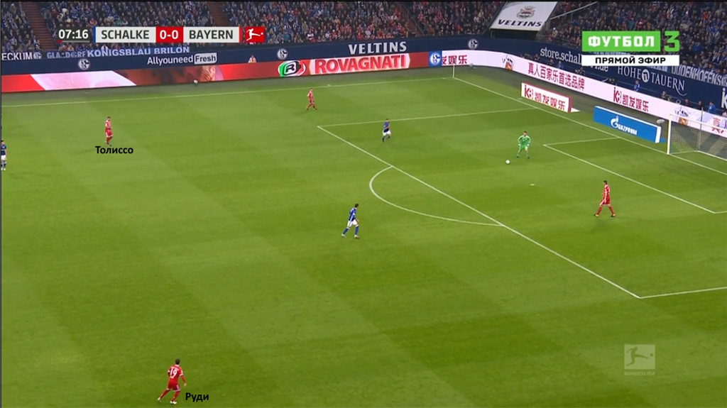 Когда мяч оказывался на флангах игроки Шальке часто втроем накрывали фулбеков «Баварии». Но после стартовых 10 минут у гельзенкирхенцов начались проблемы. Коллективный прессинг превратился в локальные выпады вингбэков Шальке.