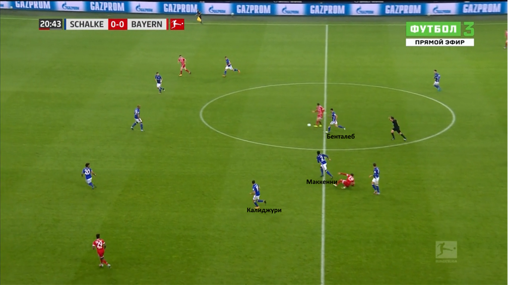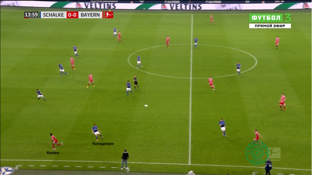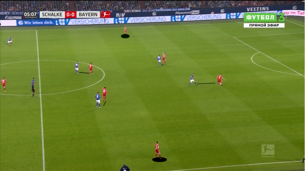 В первом тайме игроки Шальке пытались оказывать постоянное давление. Линия ПЗ располагалась достаточно высоко, но если Бавария выходила из-под прессинга, ЦПЗ и латерали достаточно долго занимали свои позиции.