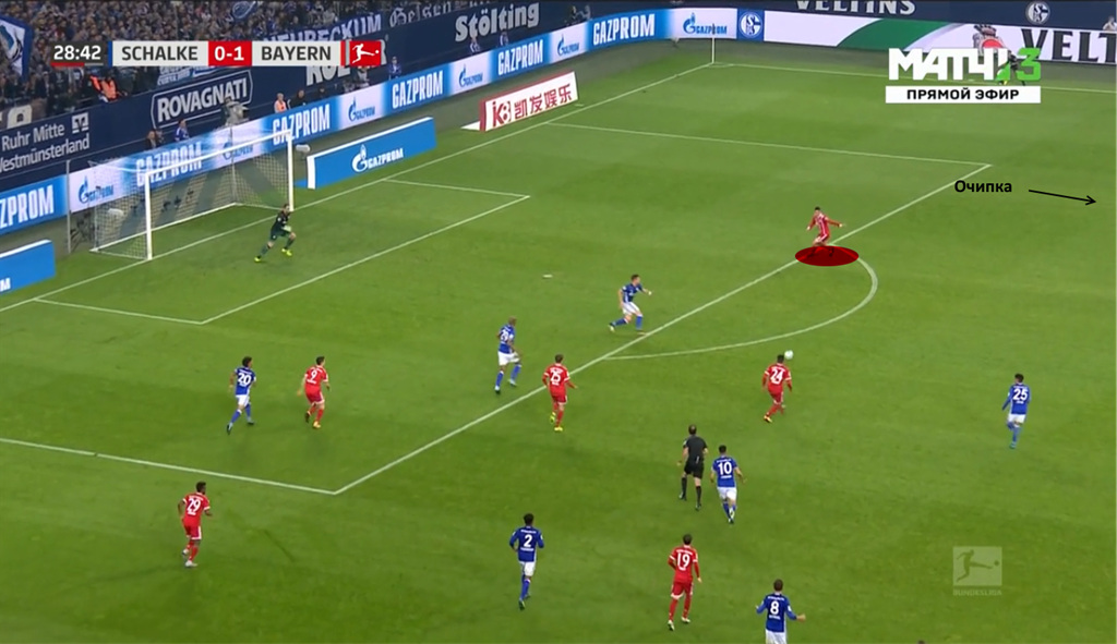 Оба ЦПЗ играли за мячом, оставив свои позиции. Бавария легко с помощью паса отыграла их, и Хамес имеет возможность продвигать мяч в полносью свободную зону.