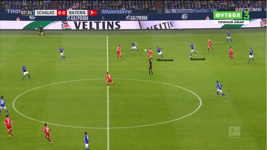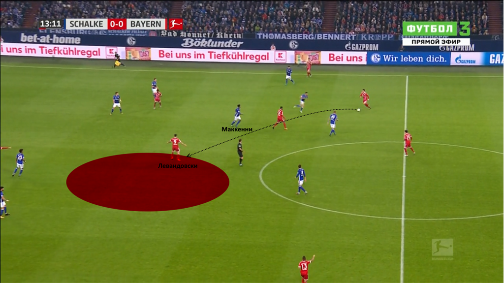 В этом случае Маккенни пошел давить на игрока, который был ближе для передачи, но там уже был Бенталеб, из-за чего зона оказалось открытой. Левандовски опустился туда и получил мяч.