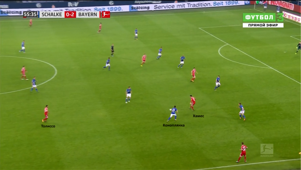 Тут он не закрывает линию передачи, Мюллер рывком уводит игрока рядом с Хамесом, а он получает мяч абсолютно один.