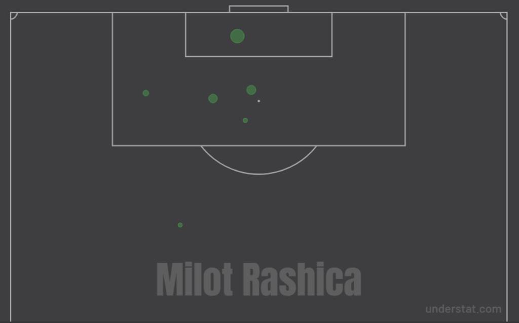 Тренерский штаб бременцев использует Рашицу в качестве одного из двух форвардов в схеме 4-3-1-2, реже в роли левого вингера в схеме 4-3-3. Но очевидно, что Милот очень комфортно себя чувствует, играя ближе к левому краю и совершая постоянные смещения в центр. Зоны, из которых забивал свои голы Рашица в этом сезоне Бундеслиги это подтверждают: