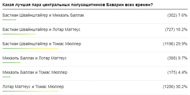 Наибольшие споры вызвала пара центральных полузащитников. Здесь, с отрывом в 10 голосов (0,3%), победу одержал тандем Лотар Маттеус — Томас Мюллер, опередивший пару Мюллер — Швайнштрайгер.