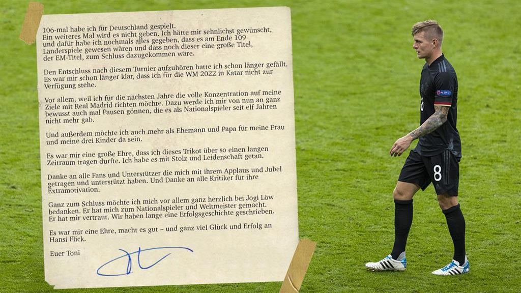 "Я сыграл за сборную Германии 106 матчей. Хотел, чтобы это число увеличилось до 109, и мы выиграли большой титул чемпионов Европы. Я долгое время принимал решение касательно того, уходить или нет после завершения Евро. Я уже давно понял, что я не сыграю на чемпионате мира-2022 в Катаре. В основном это связано с тем, что хочу следующие несколько лет полностью сосредоточиться на своих целях в мадридском Реале".