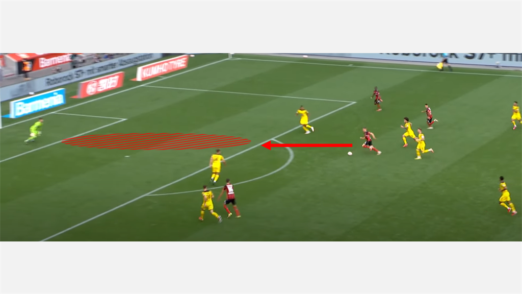 Обратите внимание на стоп-кадр ниже. Ладно Аканджи, который старался перекрыть юной звёздочки Леверкузена возможность для передачи на готовящегося вбегать в штрафную Муссу Диаби, но вот чем в этот момент занимался летний новичок "шмелей" из Вольфсбурга, и почему он столь медленно выходил на Вирца, особенно учитывая то, что по Патрику Шику играл Тома Менье, сложно сказать.