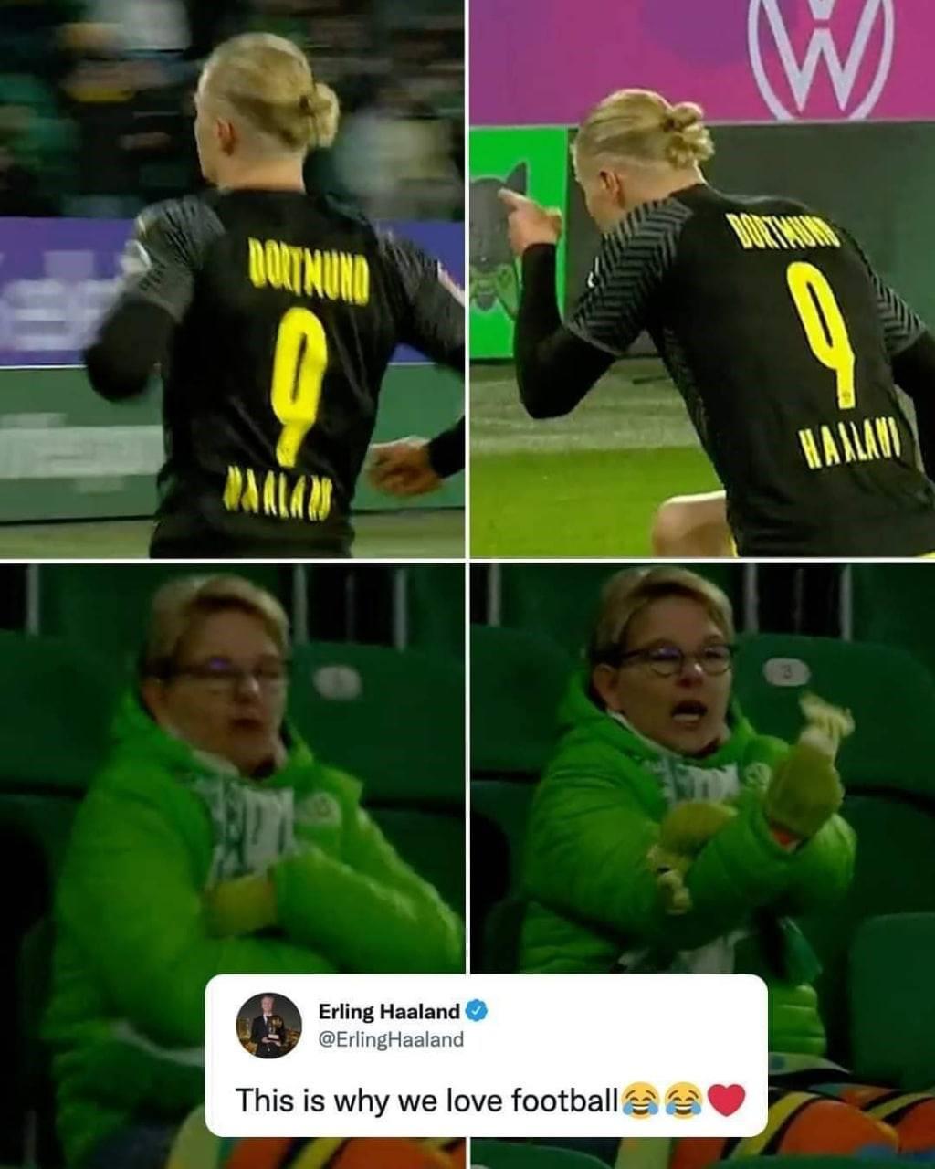 После забитого Вольфсбургу мяча Эрлинг Холанд подбежал к трибуне с фанатами "волков", сделав характерный жест то ли в их сторону, то ли в сторону камер, словив весьма негостеприимную ответку от поклонницы местной команды:-)