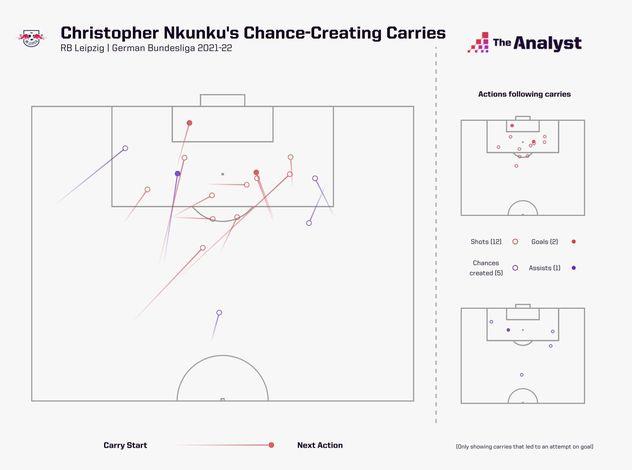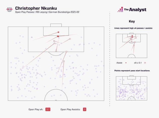 Несмотря на свои новообретенные навыки финишера, Нкунку ничуть не просел в созидательных навыках. Он создал 19 моментов с игры в этом сезоне Бундеслиги, что является четвертым показателем лиги. По показателю ожидаемых ассистов xA (3,8) Нкунку вообще первый! Его xA даже выше, чем у Мюллера, у которого девять фактических результативных передач — лучший результат лиги на данный момент.