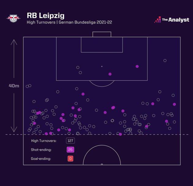 В этом сезоне ни одна другая команда не сделала столько ударов после отбора на чужой половине поля (удаленные не больше, чем на 40 метров от ворот соперника) — 25 ударов в таких ситуациях. И если сравнить этот показатель с прошлым сезоном, Лейпциг делает почти на один удар больше в среднем за игру после того, как отбирает мяч в результате высокого прессинга (2,3 против 1,4). В то же время их количество владений из 10+ передач значительно уменьшилось — с 13,0 в среднем за игру до 8,6.
