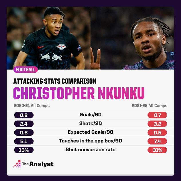 При новой системе Марша у Нкунку стало больше возможностей встречаться с мячом в непосредственной близости от ворот соперника. И когда он оказывается в атакующей ситуации, сейчас он чаще извлекает выгоду в сравнении с прошлым сезоном — он реализовал только 13% своих шансов в-2020/21, а теперь этот показатель составляет до 31%.