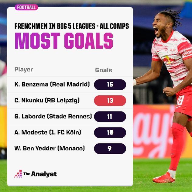 Лишь у одного французского футболиста сейчас голов больше, чем у Нкунку (13) — у Карима Бензема (15), который, в отличие от Кристофера, играет на позиции центрального нападающего.