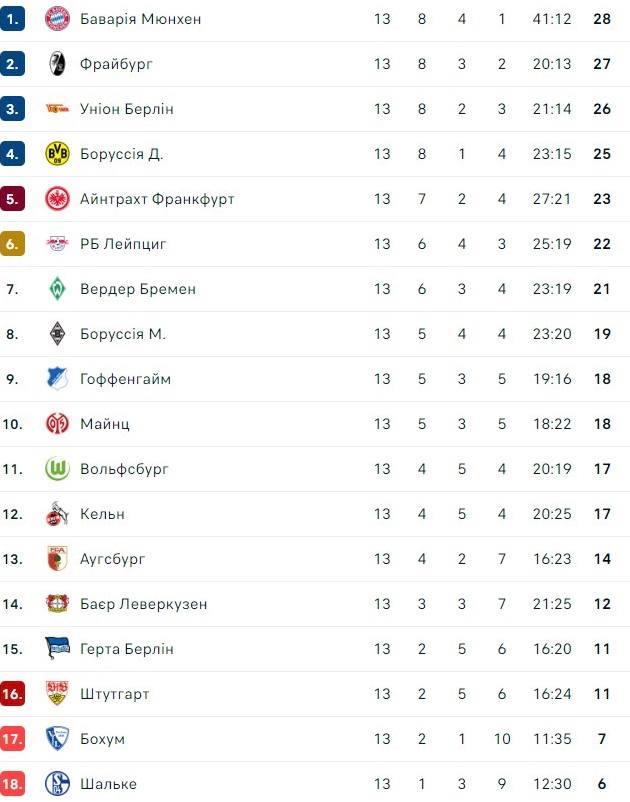 Баварія також знизила оберти у другій половину зустрічі та жодного разу не пробила у площину воріт. Станом на вечір суботи вона заскочила на перше місце у таблиці.