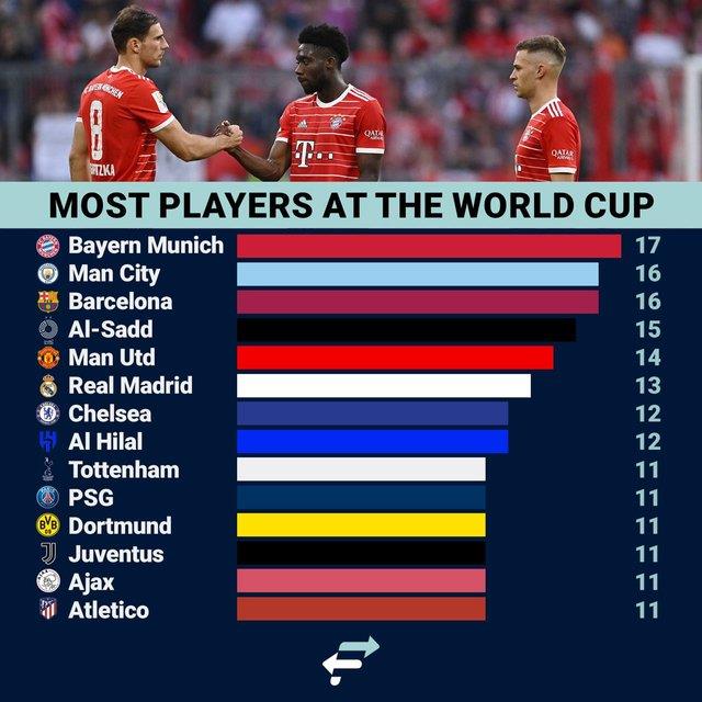 Мюнхенська Баварія стала найкращим клубом світу за кількістю футболістів, які вирушили на майбутній чемпіонат світу 2022 року в Катарі.
