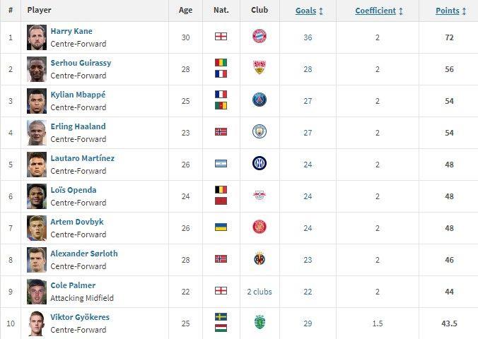 Найближчим переслідувачем Кейна став форвард Штутгарта Серу Гірассі (28 м'ячів). На третьому рядку — Кіліан Мбаппе, який залишає ПСЖ (27).