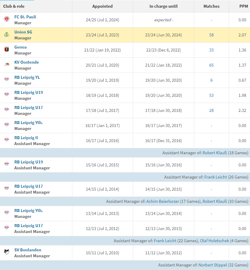 Під керівництвом німецького спеціаліста з липня 2023 року команда провела 58 матчів. Александер також має досвід роботи в Дженоа, Остенде, РБ Лейпциг і Бонландені.
