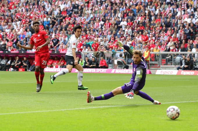 Где-то Айнтрахту откровенно везло. К примеру, в момент с ударом Томаса Мюллера от левого угла вратарской, лишь чудо могло помешать полузащитнику отличиться, однако на пути мяча стал физический объект — перекладина ворот франкфуртского клуба. Капитан Баварии имел еще одну возможность для взятия ворот — под занавес первого тайма Трапп не позволил ему ударом в одно касание отправить мяч в дальний угол после передачи от Левандовски.