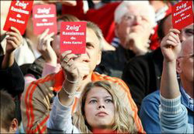 Реакция общественности была предсказуемой: «Опять негр!» - грустно матерились саппортеры. Но в этот раз дело не ограничилось только недовольством болельщиков, в разборки вступила и более известная фигура – Удо Фойгт, скандальный лидер Национал-демократической партии Германии. Эту партию Ведомство по охране конституции (есть такое в Германии) определяет как правоэкстремистскую. Фойгт начал распространять листовки с рисунками, на которых была изображена белоснежная майка немецкой сборной с двадцать пятым номером, которую носил Овомойела, и надписью – «Белый. Не просто цвет футболки. За действительно национальную сборную!»