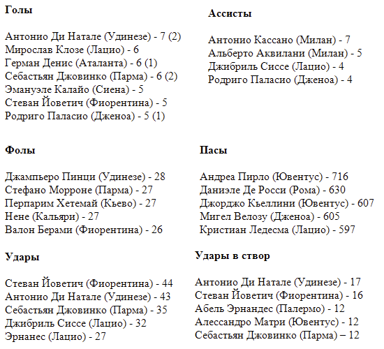 - Лучшая оборона: Удинезе (3), Сиена (6), Ювентус, Наполи (по 7)