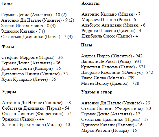 - Удары в створ: Ювентус (79), Милан (77 ), Лацио, Катанья (по 63)