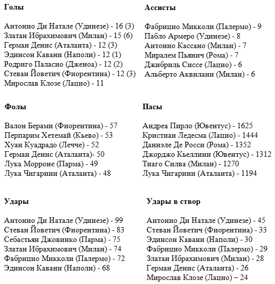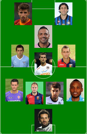 Пеголо (Сиена) (2) - Суньига (Наполи) (1), Гранквист (Дженоа) (2), Россеттини (Сиена) (1), Паскуаль (Фиорентина) (3) - Лулич (Лацио) (4), Янкович (Дженоа) (3), Пьянич (Рома) (3) - Микколи (Палермо) (3) - Милито (Интер) (3), Борини (Рома) (1)
