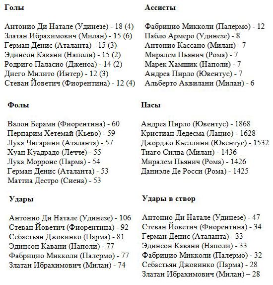 - Лучшая атака: Милан (49), Наполи (42), Лацио, Палермо (по 39)