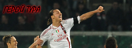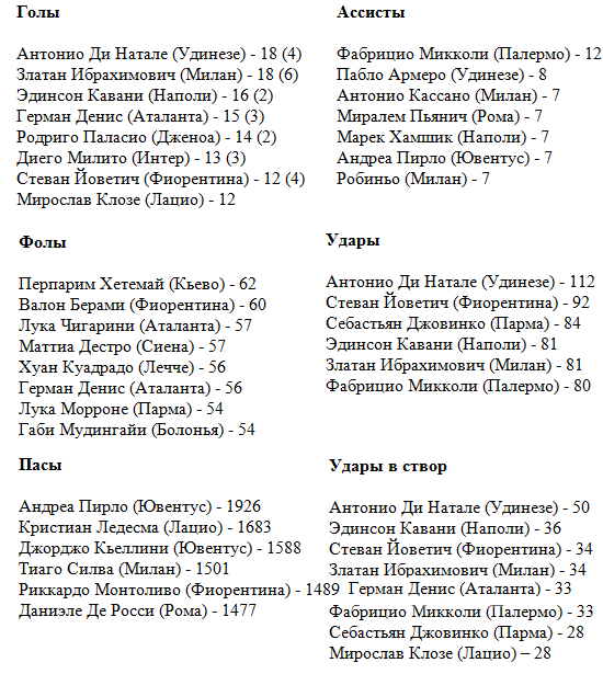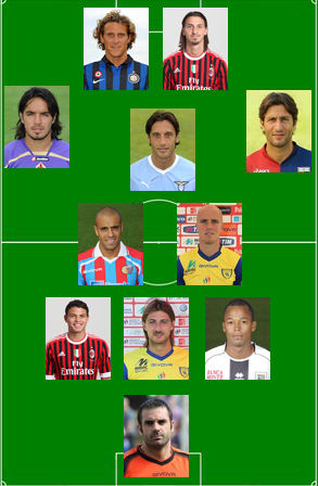 Соррентино (Кьево) (2) - Сантакроче (Парма) (1), Ачерби (Кьево) (1), Тиаго Силва (Милан) (3) - Скулли (Дженоа) (1), Маури (Лацио) (2), Брэдли (Кьево) (2), Альмирон (Катанья) (2), Варгас (Фиорентина) (1) - Ибрахимович (Милан) (7), Форлан (Интер) (1)
