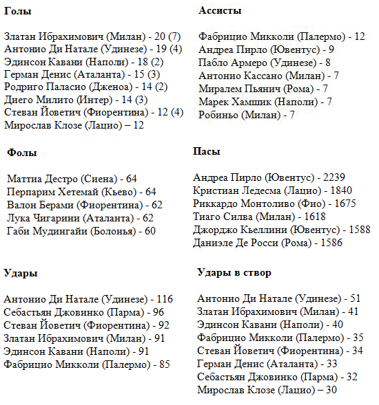 - Худшая оборона: Дженоа (49), Новара (46), Палермо, Лечче, Чезена (по 45)