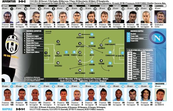 Говоря о составах команд, стоит отметить, что, скорее всего, изменения тут будут минимальные. У Ювентуса не могут сыграть травмированные Джорджо Кьеллини и Мартин Касерес, потому в старте появится новичок Лусио. Также итальянская пресса настаивает на том, что место на левом фланге займет Квадво Асамоа, а не Паоло Де Челье. В атаке, по всей видимости, ставка будет сделана на вернув