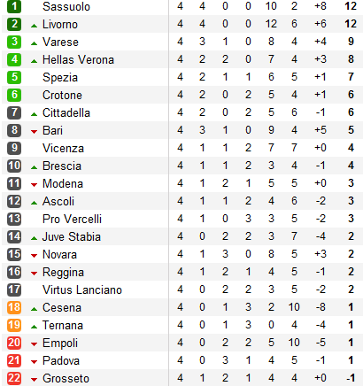 В том же темпе, что и Лаброничи, идет Сассуоло. Очередные три очка нероверди взяли в домашнем поединке с Про Верчелли - 2:1. Ливорно и Сассуоло возглавляют турнирную таблицу - лишь они после четырех туров идут без потерь.