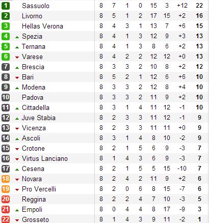 Продолжают валиться Чезена и Новара - вылетевшие из Серии А команды вновь проиграли свои матчи и чрезвычайно близки к зоне вылета. Гроссето, начавший чемпионат с показателем "-6", уже вышел из минуса, но все еще находится на последнем месте. Также в опасной зоне другие "проштрафившиеся" - Эмполи и Реджина.