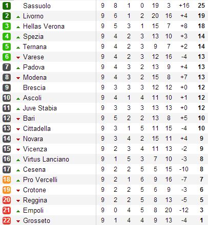 Вторым идет Ливорно - в завершающем матче джорнаты Коммунисты в гостях сумели добыть волевую победу над Эмполи благодаря Федерико Дьонизи и точному удару Паулиньо. В затылок Ливорно дышит Верона - два гола Даниэле Качии принесли Элласу три очка в матче со стоящим на вылет Гроссето. Теперь у новичка Мастиффов семь голов и в гонке бомбардиров он делит лидерство с Маттео Ардеманьи из Модены, который также отличился дважды.