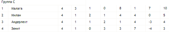 Забить удалось лишь один гол - на 73-й минуте Алешандре Пато головой замкнул навес Кевина Констана слева. Многочисленные атаки хозяев больше так и не привели к чему-то опасному, а Малага, довольствовшись ничьей, обеспечила себе выход в плей-офф. Милан поднялся на вторую строчку, но все зависит от результатов матчей с Андерлехтом и Зенитом.