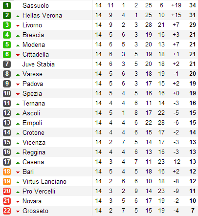 Сассуоло реабилитировался за поражение от Вероны, обыграв Новару. Гости начали неплохо, но их запал быстро сошел на нет. Подопечные Эусебио Ди Франческо могли выходить вперед под конец первого тайма (Пеше вынес мяч с линии ворот после удара Бьянко голов), но забили лишь на исходе получаса. Дель Прете в штрафной сбил Кателлани, и Эмануэле Терранова реализовал пенальти. Преимущество нероверди прекрасным ударом со штрафного закрепил объект пристального внимания Алекса Фергюсона Доменико Берарди. Сассуоло продолжает лидировать, а вот Новара скатилась на предпоследнее место.