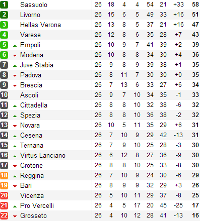 После 26-го тура Сассуоло опережает Ливорно и Верону на семь и одиннадцать очков соответственно. Подопечные Эусебио Ди Франческо свой матч выиграли, а вот преследователи неожиданно уступили - причем, проиграли вторую неделю подряд.