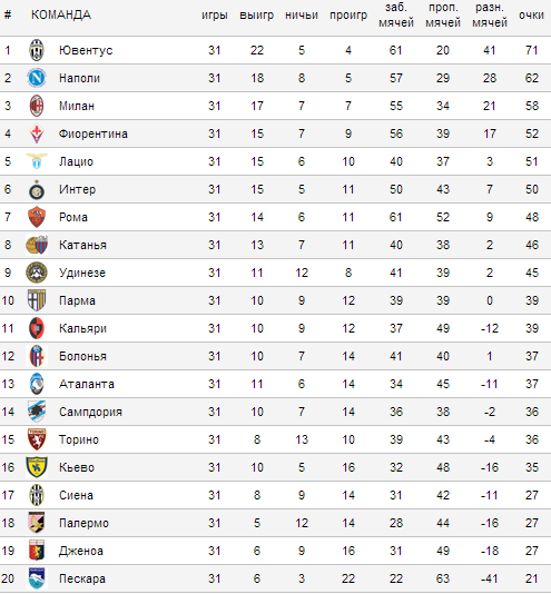 - Лучшая оборона: Ювентус (20), Наполи (29), Милан (34)