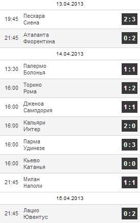 В отчетном туре лишь одной команде удалось победить дома, да и та была хозяевами лишь номинально — речь о Кальяри, обыгравшем Интер в Триесте. Палермо, Дженоа, Кьево и Милан взяли по очку на родных стадионах, а вот Пескара, Аталанта, Торино, Парма и Лацио уступили на глазах своих болельщиков.