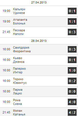 Успех команды Винченцо Монтеллы поставил Милан перед необходимостью обыгрывать Катанью. Слоны в последнее время сдали, но против россо-нери показали отличный футбол, доставив немало неприятностей подопечным Массимилиано Аллегри. Даже возвращение после дисквалификации Марио Балотелли долгое время не помогало — к середине второго тайма Милан уступал 1:2. Вышедший на замену Джампаоло Паццини, впрочем, быстро исправил ситуацию, а добил сицилийцев Марио Балотелли, как всегда безупречно реализовавший пенальти.