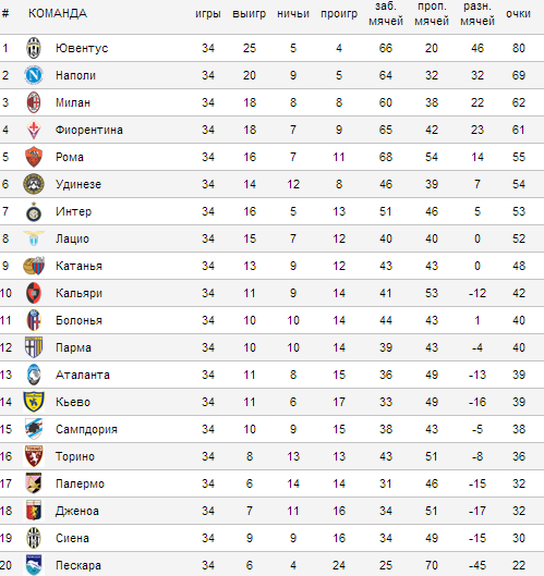 - Лучшая оборона: Ювентус (20), Наполи (32), Милан (38)